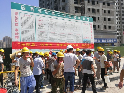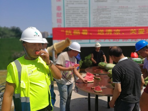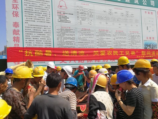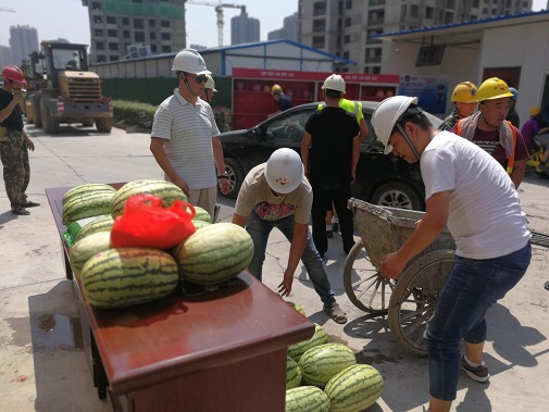 同時(shí)為進(jìn)一步推進(jìn)保障房項(xiàng)目文明施工管理,7月26日上午,公司黨委、工會(huì)、安委會(huì)再次對丈八路保障房項(xiàng)目開展送清涼·享關(guān)愛防暑降溫慰問活動(dòng)西瓜、綠豆、白糖防暑降溫送達(dá)施工一線的工人手中,并叮囑大家一定要嚴(yán)格執(zhí)行高溫措施注意勞逸結(jié)合和防暑降溫,切勿麻痹大意造成傷害。長期身處一線職工對公司黨委、工會(huì)和安委會(huì)的關(guān)愛行動(dòng)表示感謝